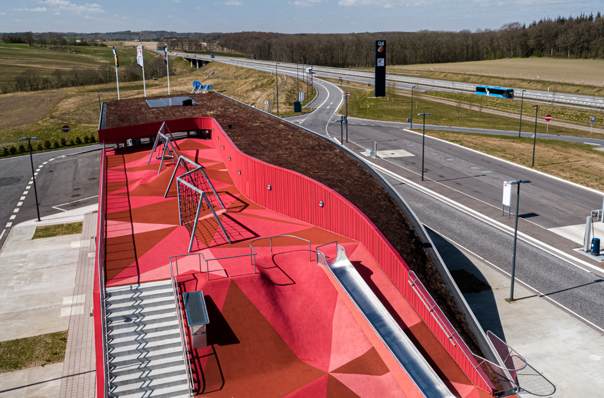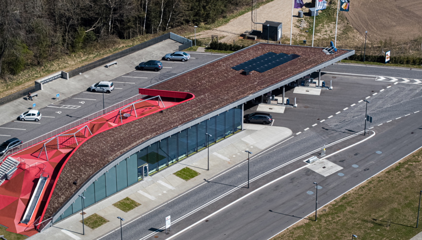 Stationerne er gennemført arkitektonisk og opbygget i bæredygtige materialer, bl.a. er tagkonstruktionens synlige del opbygget af CLT-elementer, som er monteret af vores egne tømrere.