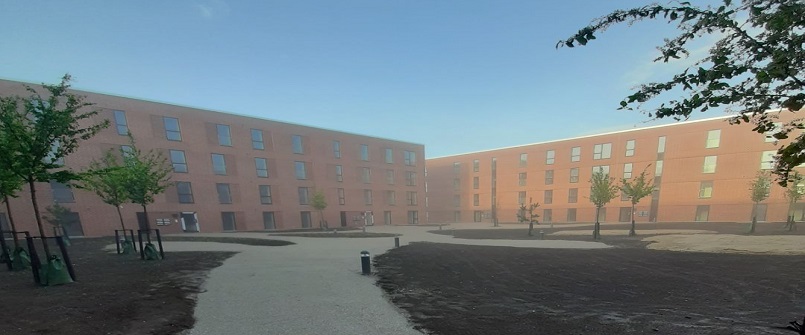 Hertil kommer tilhørende udenomsarealer, herunder p-pladser og et nyt lag asfalt på veje rundt om byggefeltet.